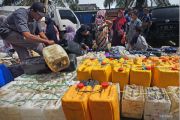 Sejumlah warga antre untuk membeli minyak goreng curah saat digelar operasi pasar di Pasar Induk Rau Serang, Banten, Senin (21/3/2022). Operasi pasar minyak goreng curah yang digelar Pemda setempat bekerja sama dengan pihak distributor itu menyalurkan lima ton minyak goreng curah yang dijual seharga Rp13 ribu per liter. ANTARA FOTO/Asep Fathulrahman/hp.