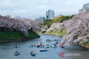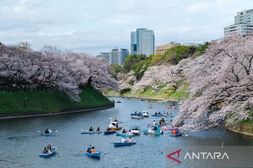 Sejumlah orang menikmati pemandangan bunga sakura yang bermekaran di sepanjang Parit Chidorigafuchi di Tokyo, Jepang, (27/3/2022). ANTARA FOTO/Xinhua/Zhang Xiaoyu/aww.