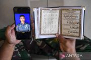 Seorang prajurit TNI AL membaca surat Al-Fatihah saat melakukan doa bersama di Mako Komando Lintas Laut Militer (Kolinlamil), di Jakarta, Senin (28/3/2022). Doa bersama tersebut dilakukan untuk mendoakan dua prajurit Korps Marinir TNI AL yakni Lettu Marinir (Anumerta) Muhammad Ikbal dan Praka Marinir (Anumerta) Wilson Anderson Here yang gugur dalam serangan kelompok separatis teroris (KST) di Distrik Kenyam, Kabupaten Nduga, Papua pada Sabtu (26/3/2022). ANTARA FOTO/M Risyal Hidayat/aww.