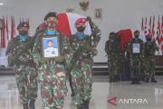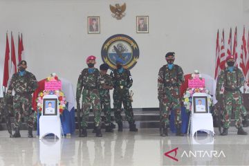 Prajurit TNI AL berada di dekat dua peti jenazah prajurit Marinir saat upacara pelepasan jenazah di Timika, Papua, Senin (28/3/2022). Dua prajurit Marinir TNI AL yakni Lettu Marinir (Anumerta) Muhammad Ikbal dan Praka Marinir (Anumerta) Wilson Anderson Here gugur dalam serangan kelompok separatis teroris (KST) di Distrik Kenyam, Kabupaten Nduga, Papua pada Sabtu (26/3/2022). ANTARA FOTO /Sevianto Pakiding/aww.