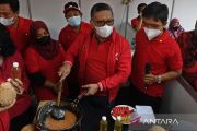 Sekretaris Jenderal Partai Demokrasi Indonesia Perjuangan (PDIP) Hasto Kristiyanto (kedua kanan) bersama kader partainya melakukan demo masak tanpa minyak goreng kelapa sawit di Sekolah Partai PDIP, Lenteng Agung, Jakarta, Senin (28/3/2022). Kegiatan tersebut digelar untuk mengampanyekan diversifikasi pangan tanpa gorengan sekaligus sebagai upaya mengurangi ketergantungan masyarakat terhadap minyak goreng kelapa sawit. ANTARA FOTO/Aditya Pradana Putra/pras.