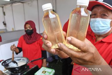 Kader Partai Demokrasi Indonesia Perjuangan (PDIP) mempraktekkan proses pembuatan minyak kelapa saat acara demo masak tanpa minyak goreng di Sekolah Partai PDIP, Lenteng Agung, Jakarta, Senin (28/3/2022). Kegiatan tersebut digelar untuk mengampanyekan diversifikasi pangan tanpa gorengan sekaligus sebagai upaya mengurangi ketergantungan masyarakat terhadap minyak goreng kelapa sawit. ANTARA FOTO/Aditya Pradana Putra/pras.