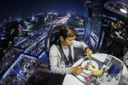 Pengunjung menyantap makanan dari ketinggian di Lounge in the Sky Indonesia di Jakarta, Selasa (29/3/2022). Destinasi wisata baru yang menawarkan sensasi menyantap hidangan dari ketinggian 50 meter dengan panorama Ibu Kota tersebut dapat dinikmati mulai dari harga Rp1,6 juta hingga Rp3,7 juta per orang. ANTARA FOTO/Sigid Kurniawan/aww.