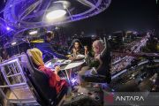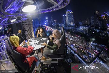 Pengunjung menikmati suasana dari ketinggian di Lounge in the Sky Indonesia di Jakarta, Selasa (29/3/2022). Destinasi wisata baru yang menawarkan sensasi menyantap hidangan dari ketinggian 50 meter dengan panorama Ibu Kota tersebut dapat dinikmati mulai dari harga Rp1,6 juta hingga Rp3,7 juta per orang. ANTARA FOTO/Sigid Kurniawan/aww.