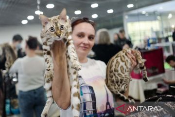 Seorang peserta menunjukkan kucingnya dalam sebuah pameran kucing di Moskow, Rusia, (2/4/2022). Lebih dari 300 kucing dari 25 lebih ras berpartisipasi dalam pameran tersebut. ANTARA FOTO/Xinhua/Bai Xueqi/aww.