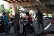 Anggota Satpol PP Kecamatan Cilandak menegur pengendara motor yang tidak memakai masker saat razia protokol kesehatan PPKM level 2 di Pondok Labu, Jakarta, Selasa (5/4/2022). PPKM level 2 untuk wilayah DKI Jakarta kembali diperpanjang selama dua pekan mulai 5 hingga 18 April 2022. ANTARA FOTO/Sigid Kurniawan/foc.