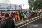 Sejumlah warga antre untuk mendapatkan takjil di Jalan Raya Tegar Beriman, Cibinong, Kabupaten Bogor, Jawa Barat, Kamis (7/4/2022). Pemerintah Kabupaten Bogor menyediakan takjil gratis bagi warga yang membutuhkan jelang waktu berbuka puasa selama bulan Ramadhan 1433 hijriah. ANTARA FOTO/Yulius Satria Wijaya/aww.