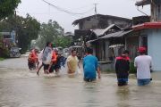 Seorang anggota Penjaga Pantai Filipina membawa seorang gadis muda saat mereka berjalan di jalan yang banjir, setelah badai tropis Megi melanda, di Provinsi Leyte, Filipina, Minggu (10/4/2022). ANTARA FOTO/PHILIPPINE COAST GUARD -HO via Reuters/hp.