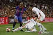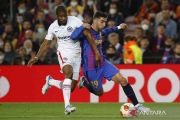 Pemain FC Barcelona Ferran Torres (kanan) berebut bola dengan pemain Eintracht Frankfurt Almamy Toure pada pertandingan babak perempat final leg kedua Liga Eropa di Stadion Camp Nou, Barcelona, Spanyol, Kamis (14/4/2022). Frankfurt lolos ke semifinal usai menang 3-2 (4-3) dari Barcelona. ANTARA FOTO/REUTERS/Albert Gea/wsj.
