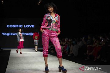 Model memperagakan busana âCosmic Loveâ karya perancang Yogiswari Pradjanti pada hari keempat Indonesia Fashion Week 2022 di Jakarta Convention Center, Jakarta, Sabtu (16/4/2022). Indonesia Fashion Week 2022 akan berlangsung hingga 17 April 2022. ANTARA FOTO/Sigid Kurniawan/wsj.