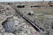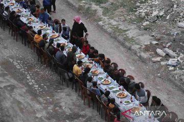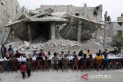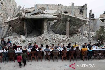 Warga berkumpul di antara puing bangunan untuk berbuka puasa saat bulan suci Ramadhan di Kota Tadef, Suriah, Senin (18/4/2022). Umat Islam di Suriah terpaksa kembali melewati Ramadhan di tengah reruntuhan setelah perang bertahun-tahun melanda negara tersebut. ANTARA FOTO/REUTERS/Khalil Ashawi/rwa.