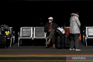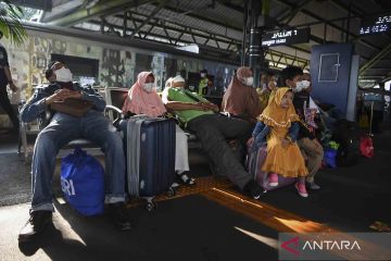 Calon penumpang kereta api Argo Dwipangga tujuan Solo menunggu kedatangan kereta di Stasiun Gambir, Jakarta, Jumat (22/4/2022). Pemerintah mengimbau masyarakat untuk melakukan perjalanan mudik lebih awal untuk menghindari serta mengurai kepadatan pada puncak arus mudik Lebaran 2022. ANTARA FOTO/Hafidz Mubarak A/wsj.