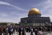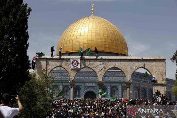 Warga Palestina berunjuk rasa di lapangan Masjid Al-Aqsa, yang dikenal umat Islam sebagai "Noble Sanctuary" dan untuk Yahudi sebagai "Temple Mount", di Kota Tua Yerusalem, Jumat (22/4/2022). ANTARA FOTO/REUTERS/Ammar Awad/wsj.