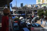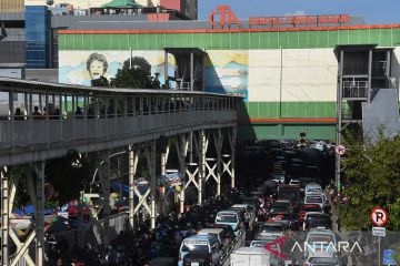 Sejumlah kendaraan terjebak kemacetan di kawasan Pasar Tanah Abang, Jakarta, Sabtu (23/4/2022). Kemacetan terjadi akibat membludaknya pengunjung yang berbelanja kebutuhan Lebaran di pasar tersebut. ANTARA FOTO/Indrianto Eko Suwarso/rwa.