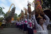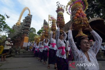 Umat Hindu menjunjung gebogan atau sesajen berisi buah, kue, bunga dan hiasan janur saat tradisi Mapeed di Pura Samuan Tiga, Desa Bedulu, Gianyar, Bali, Sabtu (23/4/2022). Tradisi tersebut kembali digelar setelah sempat ditiadakan selama dua tahun akibat pandemi COVID-19 dengan membagi setiap peserta sesuai jadwal yang telah ditentukan untuk mengurangi kerumunan. ANTARA FOTO/Nyoman Hendra Wibowo/rwa.
