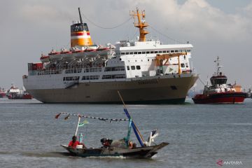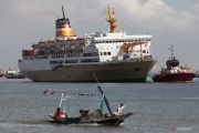 Kapal Tunda (tug-boat) memandu Kapal Motor (KM) Dobonsolo yang akan bersandar di Dermaga Jamrud Utara, Pelabuhan Tanjung Perak, Surabaya, Jawa Timur, Minggu (24/4/2022). Kapal dari Makasar tujuan Pelabuhan Tanjung Priok, Jakarta Utara itu menurunkan penumpang di Pelabuhan Tanjung Perak, Surabaya sebanyak 1.300 orang. ANTARA FOTO/Didik Suhartono/foc.