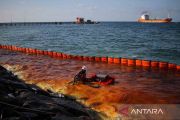 Seorang pekerja berusaha mencegah penyebaran tumpahan minyak biosolar di kawasan pesisir Desa Hagu Selatan, Lhokseumawe, Aceh, Minggu (24/4/2022). Tumpahan minyak tersebut diketahui akibat adanya kebocoran pada katup pipa kapal pengangkut minyak yang sedang merapat di pelabuhan Kota Lhokseumawe. ANTARA FOTO/Xinhua/Fachrul Reza/rwa.