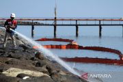 Pekerja menetralisir rembesan minyak di laut dengan Oil Spill Dispersant (OSD) pascatumpahnya solar ke laut di kawasan Pelabuhan Depot Pertamina Desa Hagu Selatan, Lhokseumawe, Aceh, Senin (25/4/2022). Hasil investigasi PT Pertamina Patra Niaga Regional Sumbagut menyatakan tumpahan solar tersebut berasal dari kebocoran bagian lambung Sea Chest kapal MT Aerosea Catalina (Masbos Diaz) sehingga menyebabkan satu ton solar merembes ke laut. ANTARA FOTO/Rahmad/pras.