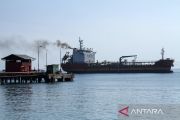 Kapal MT Aerosea Catalina (Masbos Diaz) pengangkut Solar bersandar pascakebocoran pada bagian lambung di Pelabuhan Depot Pertamina Desa Hagu Selatan, Lhokseumawe, Aceh, Senin (25/4/2022). Hasil investigasi PT Pertamina Patra Niaga Regional Sumbagut menyatakan tumpahan solar tersebut berasal dari kebocoran bagian lambung Sea Chest kapal MT Aerosea Catalina (Masbos Diaz) sehingga menyebabkan satu ton solar merembes ke laut. ANTARA FOTO/Rahmad/pras.
