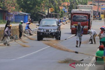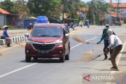 Sejumlah warga menunggu pengendara motor memberi sedekah dengan melempar uang di Jembatan Sewo, Jalur Pantura Sukra Indramayu, Jawa Barat, Senin (25/4/2022). Aksi mengambil uang sedekah menggunakan sapu tersebut dapat membahayakan keselamatan pengguna jalan terutama saat arus mudik. ANTARA FOTO/Dedhez Anggara/pras.