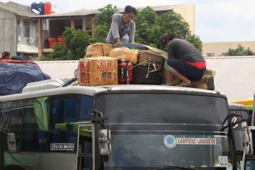 Pekerja menata barang bawaan pemudik di atas kap bus sebelum keberangkatan di Terminal Kalideres, Jakarta Barat, Rabu (27/4/2022). Puncak mudik Terminal Kalideres diprediksi terjadi pada H-3 Lebaran 2022 atau Jumat (29/4/2022). ANTARA FOTO/Muhammad Iqbal/foc.1