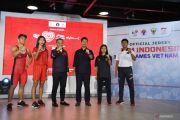 Ketua Umum Komite Olimpiade Indonesia (NOC) Raja Sapta Oktohari (ketiga kanan) bersama CdM kontingen Indonesia untuk SEA Games 2021 Ferry J Kono (ketiga kiri) berpose dengan lifter Rahmat Erwin Abdullah (kiri), pelari gawang Emilia Nova (kedua kiri), karateka Krisda Putri Aprilia (kedua kanan), dan atlet panah Riau Ega (kanan) yang menggunakan official jersey untuk SEA Games 2021 saat peluncurannya di Jakarta, Kamis (28/4/2022). Li-Ning menjadi brand official untuk jersey dan apparel tim Indonesia pada perhelatan SEA Games 2021 di Vietnam. ANTARA FOTO/Hafidz Mubarak A/hp.