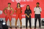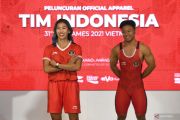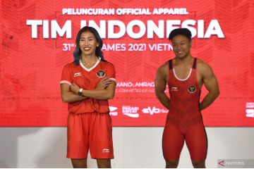 Lifter Rahmat Erwin Abdullah (kanan) bersama pelari gawang Emilia Nova (kedua kiri) menggunakan official jersey untuk SEA Games 2021 saat peluncurannya di Jakarta, Kamis (28/4/2022). Li-Ning menjadi brand official untuk jersey dan apparel tim Indonesia pada perhelatan SEA Games 2021 di Vietnam. ANTARA FOTO/Hafidz Mubarak A/hp.
