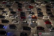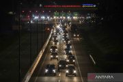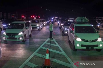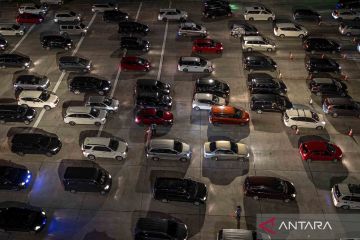 Sejumlah kendaraan roda empat antre untuk memasuki Gerbang Tol Kalikangkung, Semarang, Jawa Tengah, Kamis (28/4/2022). Volume kendaraan arus mudik Tol Trans Jawa Batang-Semarang dari arah Jakarta yang memasuki Gerbang Tol Kalikangkung menuju ke sejumlah wilayah di Jawa Tengah dan Jawa Timur pada H-4 Lebaran hingga Kamis (28/4) pukul 23:00 WIB terpantau padat. ANTARA FOTO/Aji Styawan/wsj.