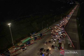 Foto udara antrean kendaraan roda empat yang akan memasuki Gerbang Tol Kalikangkung, Semarang, Jawa Tengah, Kamis (28/4/2022). Volume kendaraan arus mudik Tol Trans Jawa Batang-Semarang dari arah Jakarta yang memasuki Gerbang Tol Kalikangkung menuju ke sejumlah wilayah di Jawa Tengah dan Jawa Timur pada H-4 Lebaran hingga Kamis (28/4) pukul 23:00 WIB terpantau padat. ANTARA FOTO/Aji Styawan/wsj.