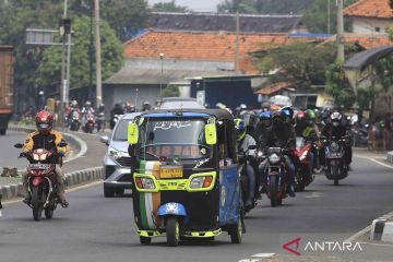 Pemudik yang menggunakan bajaj melintas di jalur Pantura Simpang Lohbener, Indramayu, Jawa Barat, Jumat (29/4/2022). Pemudik menggunakan kendaraan khas ibu kota untuk pulang kampung tersebut menjadi perhatian warga daerah karena keunikannya. ANTARA FOTO/Dedhez Anggara/wsj.