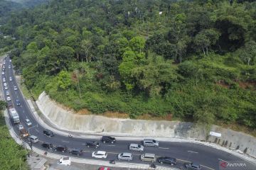 Foto udara antrean kendaraan pemudik di jalur selatan Kadipaten Gentong, Kabupaten Tasikmalaya, Jawa Barat, Jumat (28/4/2022). Pada H-3 Lebaran 2022 arus lalu lintas di jalur selatan Jawa Barat menuju Jawa Tengah terpantau padat dan diberlakukannya sistem satu arah untuk mengurai kemacetan. ANTARA FOTO/Adeng Bustomi/hp.