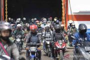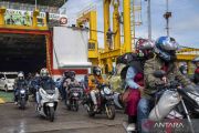 Pemudik bersepeda motor antre keluar kapal saat tiba di Pelabuhan Bakauheni, Lampung Selatan, Lampung, Jumat (29/4/2022). Pada puncak arus mudik lebaran 2022, ribuan pemudik tiba di Pelabuhan Bakauheni Lampung. ANTARA FOTO/Nova Wahyudi/wsj.