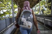 Pemudik dengan kucing peliharaanya turun dari atas kapal saat tiba di Dermaga Tiga, Pelabuhan Bakauheni, Lampung Selatan, Lampung, Jumat (29/4/2022). Pada puncak arus mudik lebaran 2022, ribuan pemudik tiba di Pelabuhan Bakauheni Lampung. ANTARA FOTO/Nova Wahyudi/wsj.