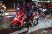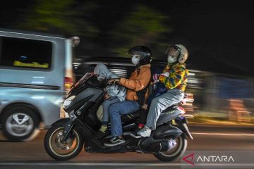 Pemudik bersepeda motor melintas di Simpang Jomin, Karawang, Jawa Barat, Sabtu (30/4/2022). Pada H-2 lebaran jalur mudik Simpang Jomin Pantura didominasi oleh kendaraan roda dua. ANTARA FOTO/Muhammad Adimaja/wsj.