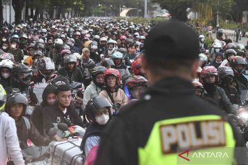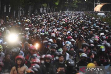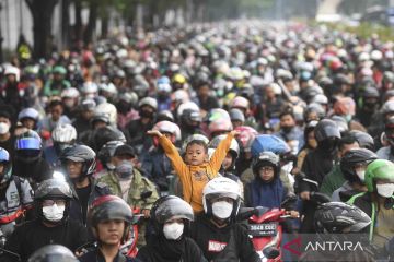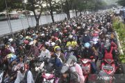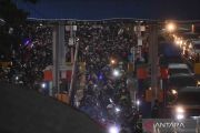 Pemudik bersepeda motor antre untuk memasuki Pelabuhan Merak di Banten, Sabtu (30/4/2022). Pelabuhan Merak dipadati puluhan ribu pemudik berkendaraan roda dua. ANTARA FOTO/Akbar Nugroho Gumay/wsj.