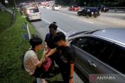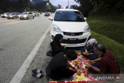 Sejumlah pemudik berhenti di bahu jalan tol untuk membatalkan puasanya di tengah arus mudik menjelang Hari Raya Idul Fitri 1433 H di Gombak, Selangor, Malaysia, Jumat (29/4/2022). ANTARA FOTO/REUTERS/Hasnoor Hussain/wsj.
