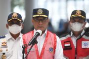 Menteri Perhubungan Budi Karya Sumadi memberikan keterangan terkait arus mudik 2022 di Pelabuhan Merak, Banten, Sabtu (30/4/2022). Menhub menyatakan puncak arus mudik Ramadhan 2022 secara umum sudah berlalu dan akan mulai mengalami penurunan. ANTARA FOTO/Akbar Nugroho Gumay/hp.