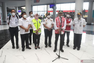 Menteri Perhubungan Budi Karya Sumadi (tengah) memberikan keterangan terkait arus mudik 2022 di Pelabuhan Merak, Banten, Sabtu (30/4/2022). Menhub menyatakan puncak arus mudik Ramadhan 2022 secara umum sudah berlalu dan akan mulai mengalami penurunan. ANTARA FOTO/Akbar Nugroho Gumay/hp.