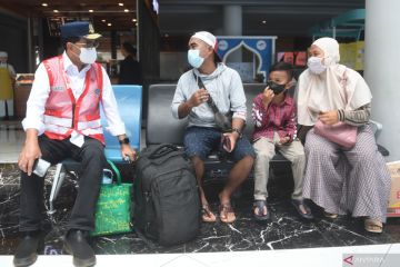 Menteri Perhubungan Budi Karya Sumadi (kiri) berbincang dengan pemudik sebelum memberikan keterangan terkait arus mudik 2022 di Pelabuhan Merak, Banten, Sabtu (30/4/2022). Menhub menyatakan puncak arus mudik Ramadhan 2022 secara umum sudah berlalu dan akan mulai mengalami penurunan jumlah pemudik. ANTARA FOTO/Akbar Nugroho Gumay/hp.