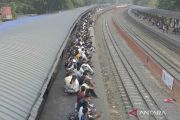 Para pemudik duduk di atap kereta yang meninggalkan sebuah stasiun di Dhaka, Bangladesh, Jumat (29/4/2022). Menjelang Hari Raya Idul Fitri, ratusan ribu warga Dhaka berbondong-bondong keluar kota untuk merayakan lebaran bersama sanak saudara mereka di kampung halaman. ANTARA FOTO/Xinhua/Salim/wsj.