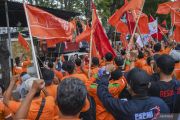 Massa yang tergabung dalam Partai Buruh melakukan unjuk rasa dalam rangka memperingati Hari Buruh Internasional di depan kantor KPU RI, Jakarta Pusat, Minggu (1/5/2022). Dalam aksinya mereka menuntut pemerintah untuk tetap melaksanakan pemilu pada 14 Febuari 2024, meminta pemerintah untuk menurunkan harga bahan pokok serta menolak Omnimbus Law UU Cipta Kerja. ANTARA FOTO/Galih Pradipta/hp.