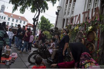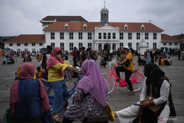 Warga berwisata di Taman Fatahillah, Kota Tua, Jakarta Barat, Rabu (4/5/2022). Warga mengisi hari libur dan cuti Lebaran dengan berwisata ke berbagai tempat wisata di Ibu Kota. ANTARA FOTO/Sigid Kurniawan/hp.