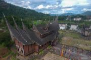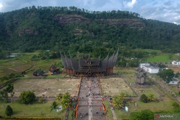 Foto udara pengunjung berwisata di Istano Basa Pagaruyung, Kabupaten Tanah Datar, Sumatera Barat, Rabu (4/5/2022). Destinasi wisata sejarah dan budaya museum berupa replika istana Kerajaan Pagaruyung itu menjadi tujuan favorit wisatawan saat libur Lebaran. ANTARA FOTO/Iggoy el Fitra/hp.