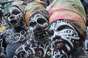Gadis-gadis dengan wajah dicat mengambil bagian dalam parade saat Karnaval Popo di Bonoua, Pantai Gading, 3Sabtu (30/4/2022. ANTARA FOTO/Reuters-Luc Gnago/hp.