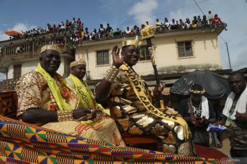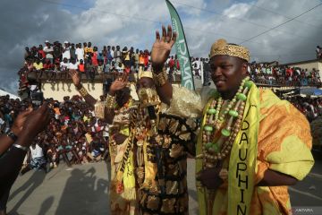 Ettia Kouassi Paul, terpilih sebagai "Ebe", pria paling tampan, melambaikan tangan saat mengikuti parade Karnaval Popo, di Bonoua, Pantai Gading, Sabtu (30/4/2022. ANTARA FOTO/Reuters-Luc Gnago/hp.