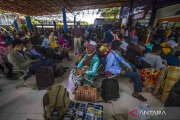 Calon penumpang menunggu jadwal keberangkatan kapal laut di Pelabuhan Bandarmasih, Banjarmasin, Kalimantan Selatan, Jumat (6/5/2022). PT Pelabuhan Indonesia (Pelindo) Regional 3 Banjarmasin mencatat sebanyak 700 orang penumpang dan 113 kendaraan tiba di Pelabuhan Bandarmasih pada H+3 Lebaran dan akan terus bertambah hingga puncak arus balik yang diperkirakan terjadi pada 7-8 Mei 2022. ANTARA FOTO/Bayu Pratama S/wsj.