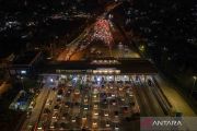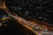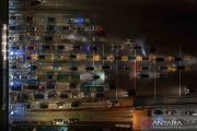 Foto udara sejumlah kendaraan roda empat yang didominasi pemudik antre memasuki Gerbang Tol (GT) Banyumanik, Kota Semarang, Jawa Tengah, Jumat (6/5/2022) malam. Menurut data harian Posko Pengamanan Lebaran GT Banyumanik, pada Jumat (6/5) antara pukul 00:00 WIB hingga 20:30 WIB, tercatat sebanyak 38.675 unit kendaraan melintasi gerbang tol dalam kota tersebut dari arah Solo dan Jawa Timur ke arah Jakarta dan Jawa Barat, serta 18.838 unit kendaraan ke arah sebaliknya. ANTARA FOTO/Aji Styawan/wsj.