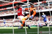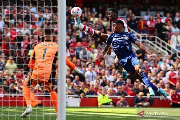 Pemain Arsenal Eddie Nketiah mencetak gol ke gawang Leeds United dalam laga sepak bola Liga Inggris di Emirates Stadium, London, Inggris, Minggu (8/5/2022). Arsenal menang dengan skor 2-1. ANTARA FOTO/REUTERS/David Klein/foc.