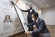 Duta Besar Jepang untuk Indonesia Kanasugi Kenji (kanan) membubuhkan tanda tangan disaksikan Direktur Utama Perum LKBN Antara Meidyatama Suryodiningrat (kiri) usai mengikuti sesi wawancara khusus bersama Kantor Berita Antara di Wisma Antara, Jakarta, Rabu (11/5/2022). Dalam kegiatan tersebut Kanasugi Kenji membahas terkait hubungan bilateral Jepang-Indonesia serta Presidensi G20 Indonesia. ANTARA FOTO/Dhemas Reviyanto/pras.