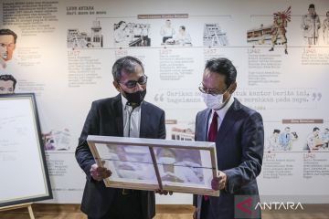 Direktur Utama Perum LKBN Antara Meidyatama Suryodiningrat (kiri) menyerahkan cenderamata kepada Duta Besar Jepang untuk Indonesia Kanasugi Kenji (kanan) usai mengikuti sesi wawancara khusus bersama Kantor Berita Antara di Wisma Antara, Jakarta, Rabu (11/5/2022). Dalam kegiatan tersebut Kanasugi Kenji membahas terkait hubungan bilateral Jepang-Indonesia serta Presidensi G20 Indonesia. ANTARA FOTO/Dhemas Reviyanto/pras.